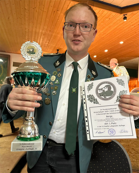 Der Schützenverein Berge e.V. hat an der Rundenwettkampfsaison 2025/26 des Schützenkreises Nordwest mit 18 Sportschützen und 4 Sportschützinnen in 4 Auflagemannschaften erfolgreich teilgenommen. Dabei haben sie zwei Gruppen- sowie einen Einzelsieg erringen können.